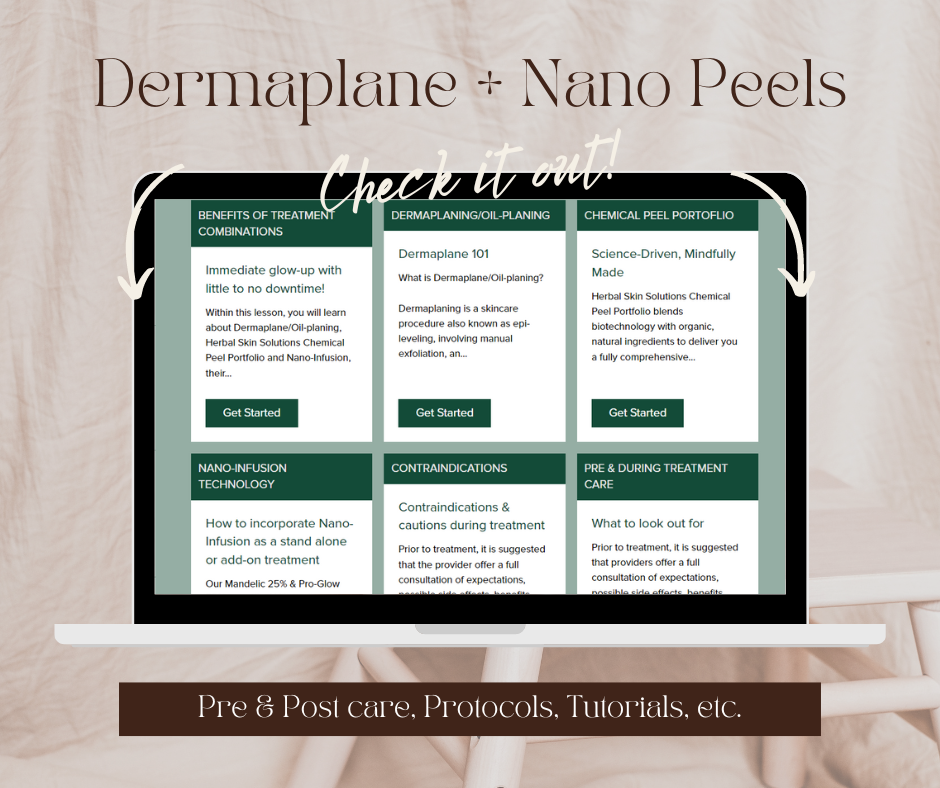 In this virtual training, you will have access to our in-depth advanced Dermaplane/Oil-planing + Nano-Infusion with Herbal Skin Solutions CIT Pen and professional grade chemical peel portfolio (Mandelic 25% and Pro-Glow 55%) to confidently offer your clients a deeper exfoliation, epidermal infusion of brightening, antibacterial and anti-inflammatory properties, with little risk and no downtime. This go-at-your-own pace training explores various techniques and advanced modalities to customize your own unique peel protocol, proper client selection, contraindications to be aware of, full product ingredient breakdowns, sample protocols, pre and post-care instructions, marketing resources and on-going education. You will be provided an official Certificate of Completion after passing the course exam with an 80% or higher.