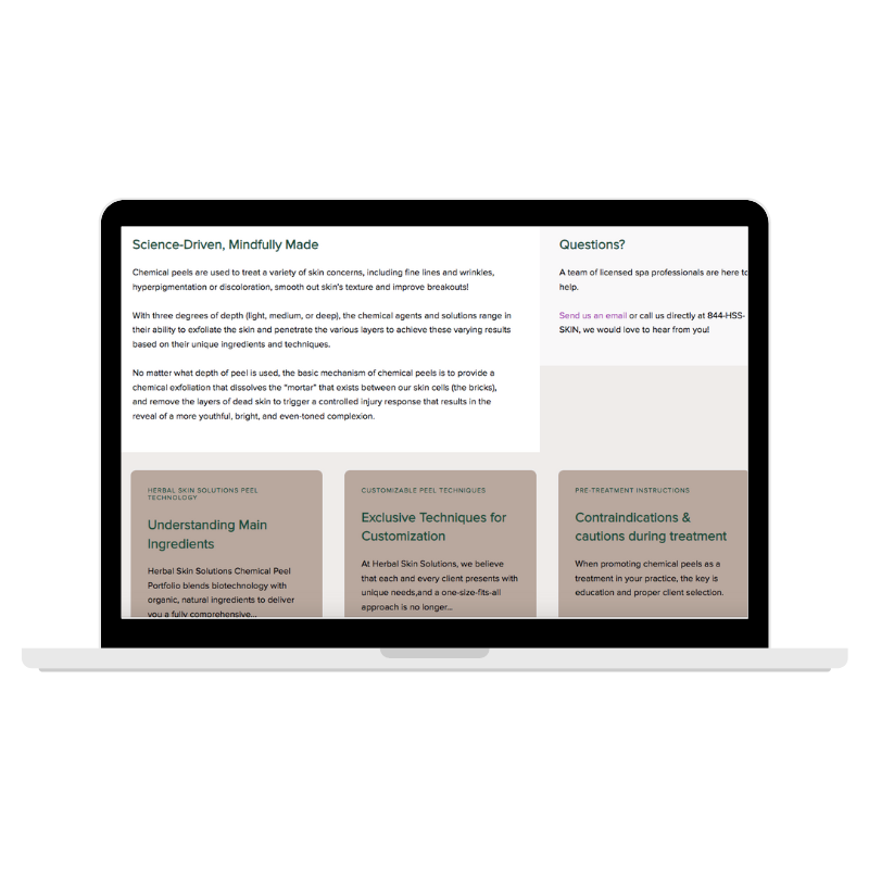 As science & formulations evolve, so does the education we facilitate in our training and sample protocols. Receive free access to this virtual course with the purchase of Herbal Skin Solutions Chemical Peel bundle.*Limited to one free account per training sign-up purchased*